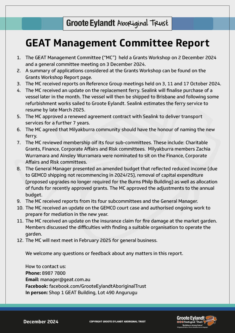 The GEAT community committee members meet prior to the full Management Committee Meeting to raise and discuss current community matters that need further interpretation and cultural expression. The purpose of which is to ensure that the current matters before the (MC) are fully translated and comprehended.